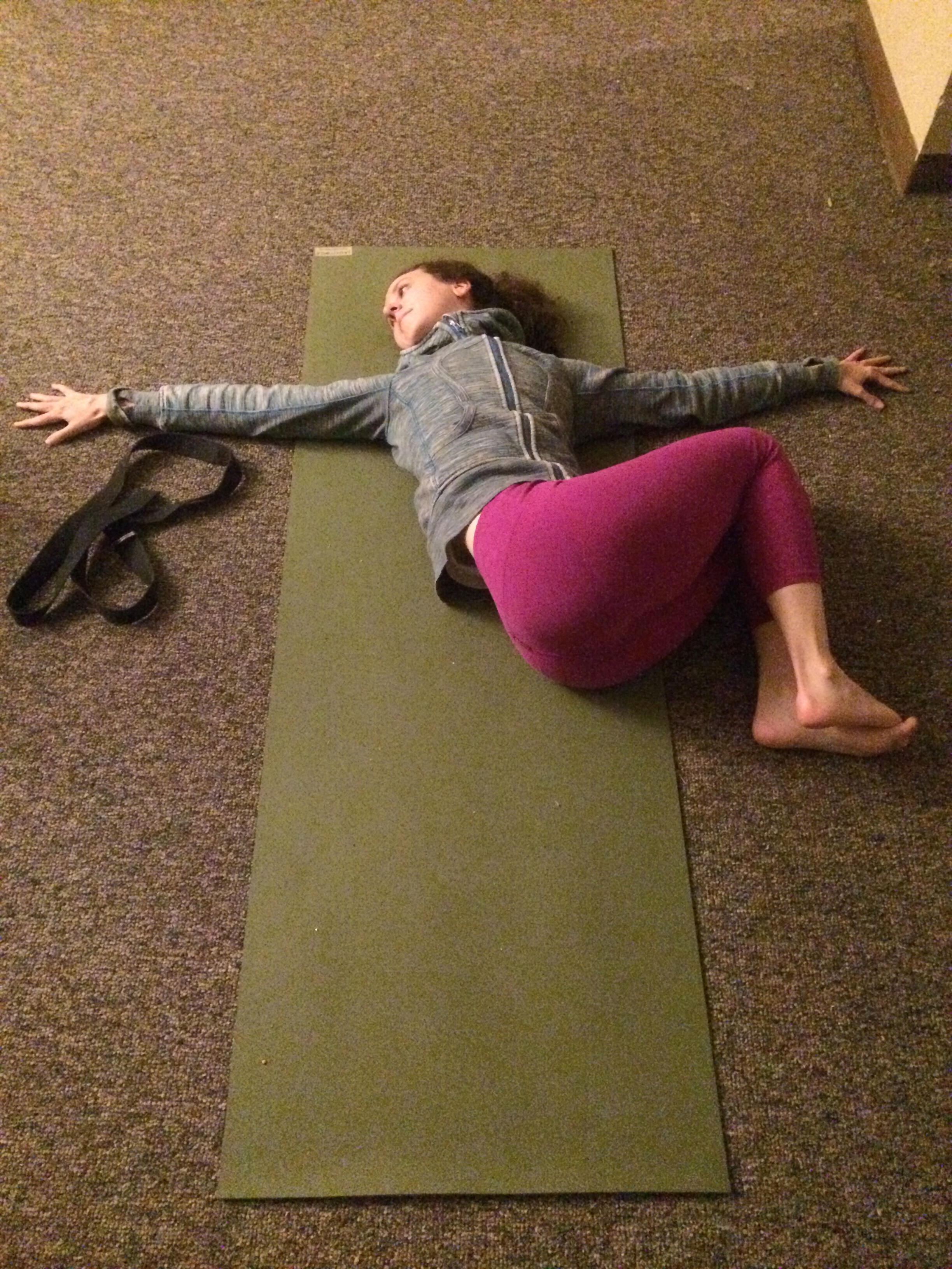 Again, take a moment to stretch the body out before jumping into the next posture. Then, you are going to come into a simple cross-legged position, but while still on your back. Start with your right shin in front of the left. If this hurts your knees, takes blocks or blankets under them to elevate a little. If you have tight hips, this will be a little uncomfortable for you. Release your ams to your sides and just breath. Be sure to do this on both sides.