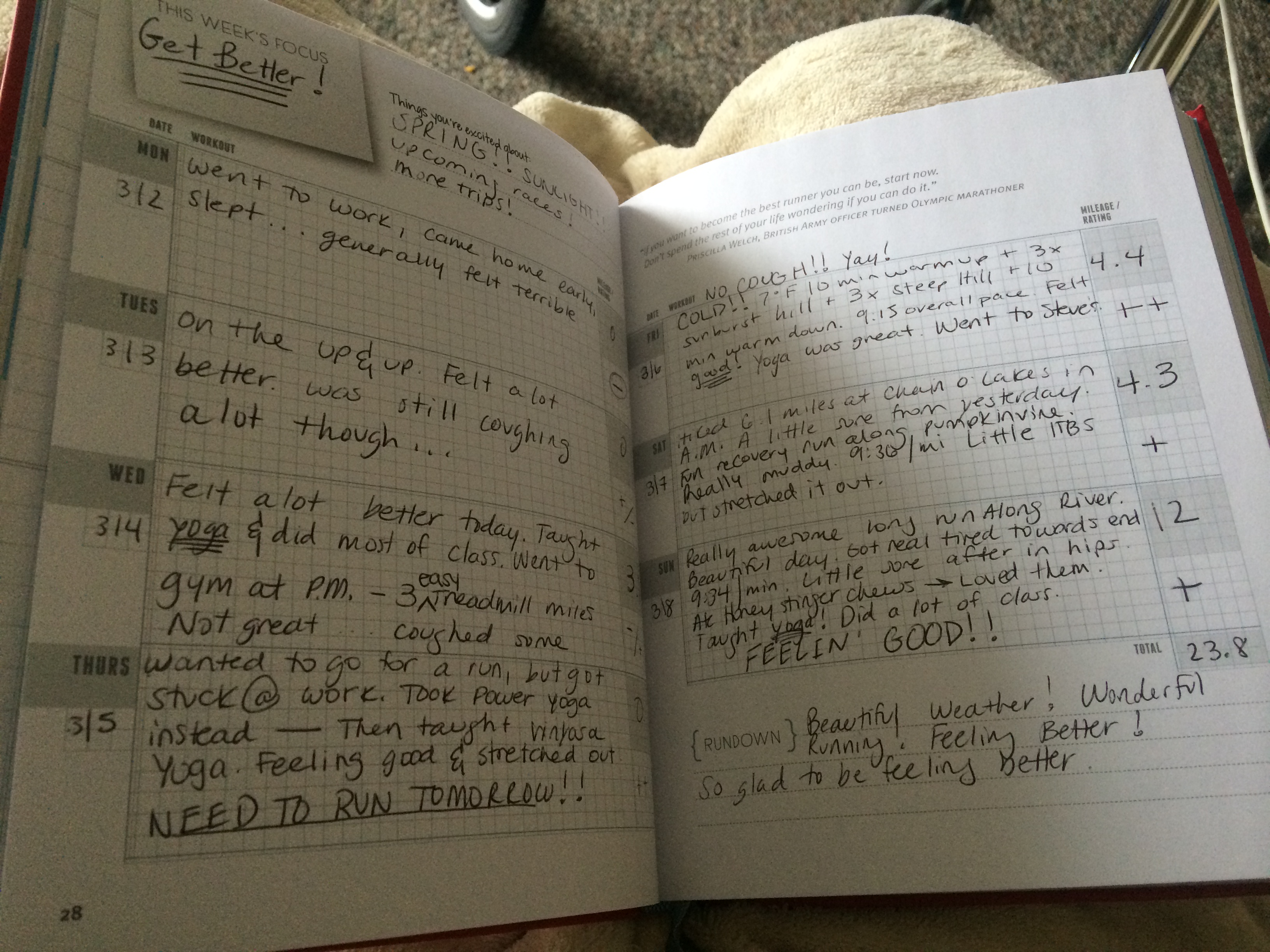 My total milage for the week was 12.1. Oh well…. I’m gonna sleep a lot and hopefully be back to my usual self next week.
